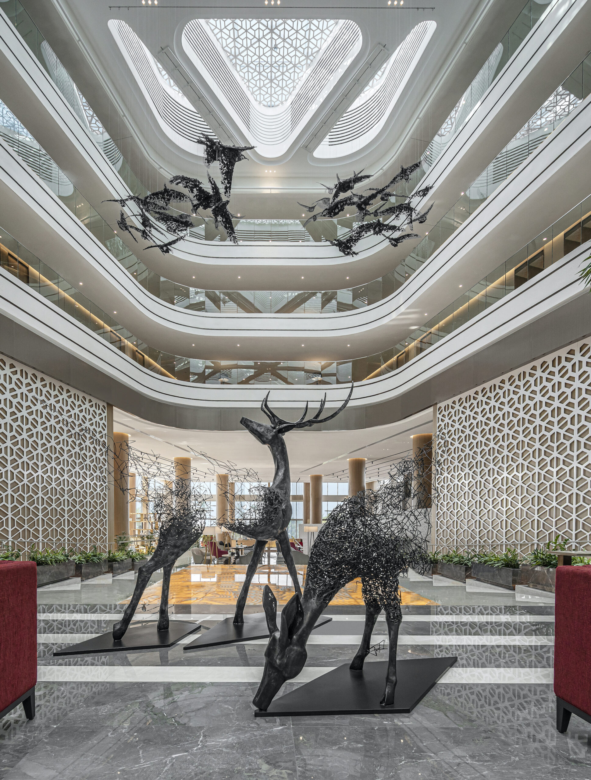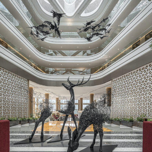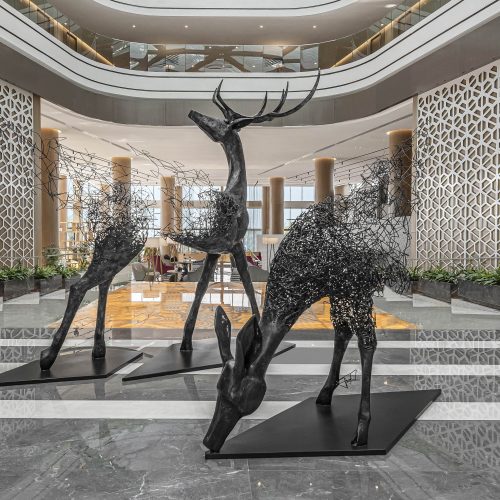 Description JA Lake View Hotel is located in Jabal Ali where gazelles, horses, and wild birds can often be observed in its surrounding. Courtyard Arts extended this experience to the hotel lobby by commissioning the Japanese artist and sculptor, Tomohiro Inaba, and the Italian artist and sculptor, Edoardo Tresoldi, to create an installation of gazelles and a flock of birds, mimicking it’s natural environment.